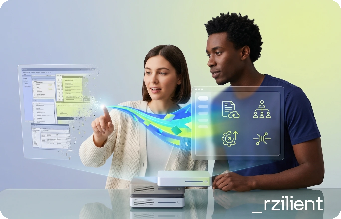 _rzilient est la première solution tout-en-un, développée en interne, qui réconcilie IT & RH grâce à une gestion synchronisée et automatisée, simplement.