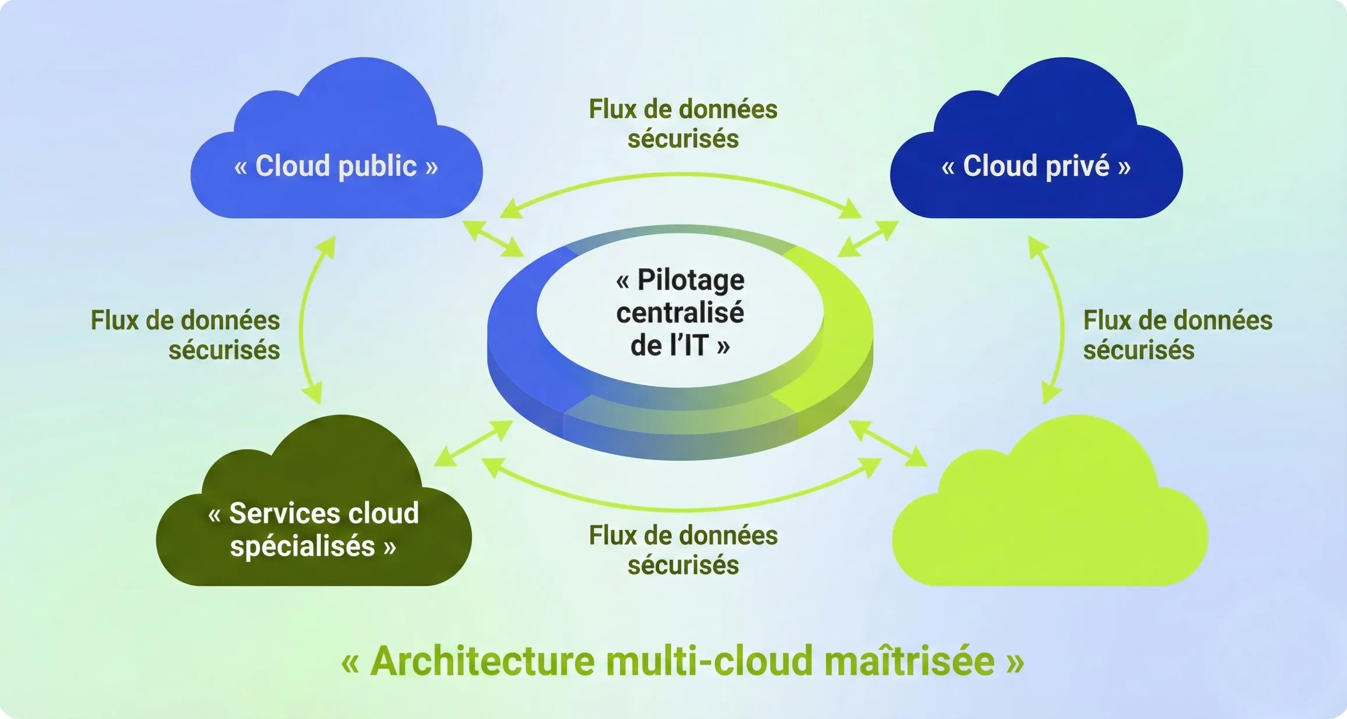 - Multi-cloud : utilisation de plusieurs fournisseurs cloud distincts, sans dépendance unique.