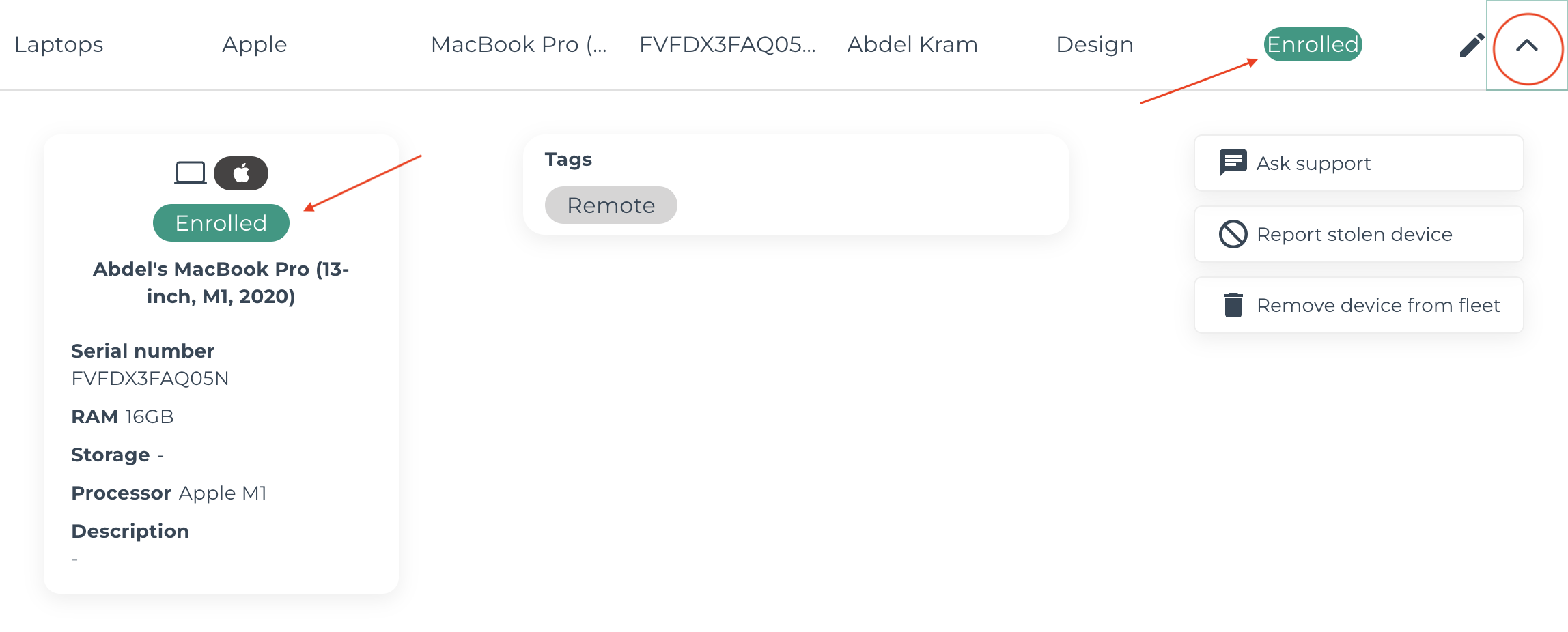 Depuis l'onglet "Flotte", vous avez accès à plusieurs données dont un statut pour chaque équipement* dans votre flotte :
